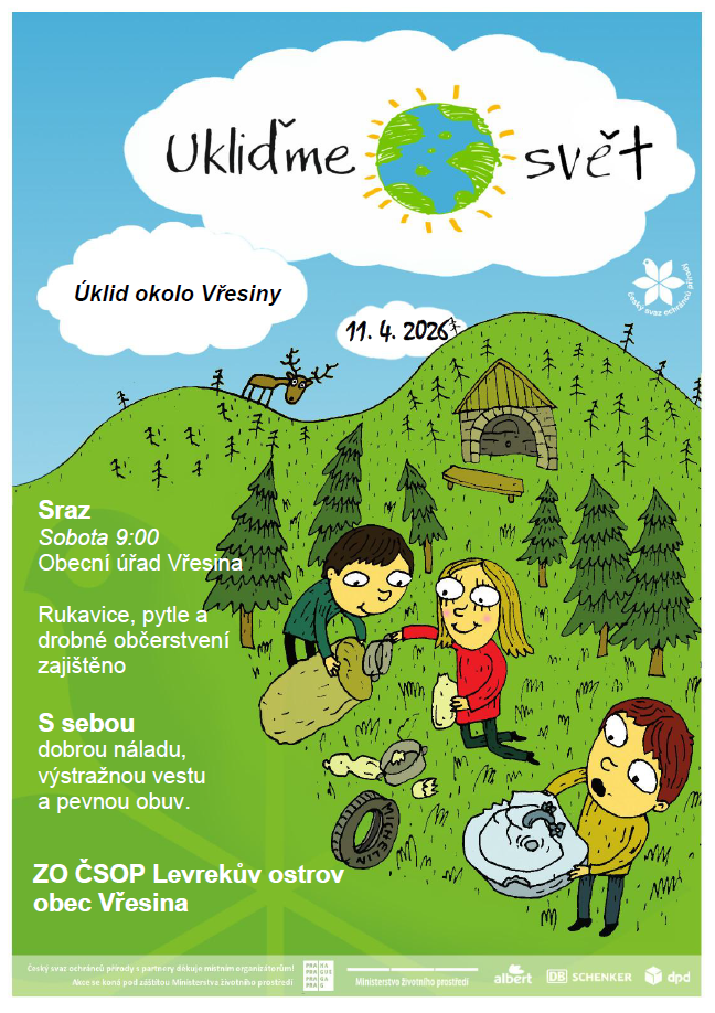 Sraz účastníků je naplánován na 9:00 u Obecního úřadu Vřesina. Pro dobrovolníky budou připraveny rukavice a pytle na odpad, chybět nebude ani drobné občerstvení. Organizátoři doporučují vzít si pevnou obuv, výstražnou vestu a především dobrou náladu.
